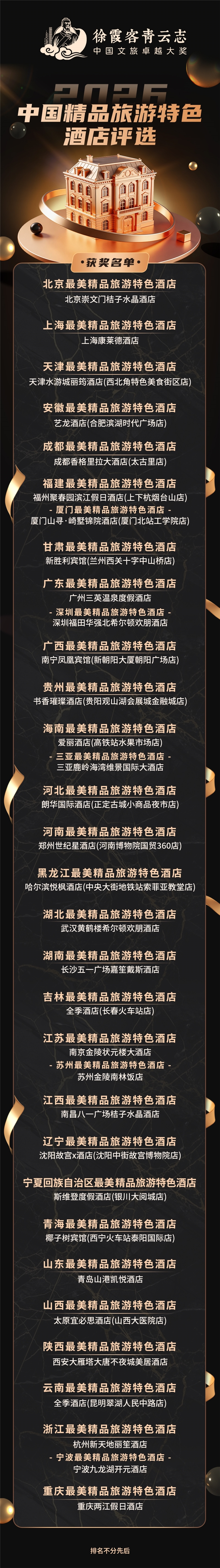 徐霞客青云志中国文旅卓越大奖,以传承徐霞客探索精神、聚焦口碑价值、发掘文旅标杆、赋能产业升级为核心宗旨,覆盖“吃、住、行、游、购、娱”旅游全产业链要素,是国内极具公信力与行业影响力的文旅综合评选IP。本次精品旅游特色酒店专项评选,深度结合城市文旅风貌与酒店核心竞争力,从景观设计、在地文化融合、服务水准、特色体验、市场口碑等多重维度综合评定,致力于挖掘兼具城市独特气质与顶尖行业水准的优质住宿品牌,为广大消费者提供权威、可信的出行住宿参考。 来自全国各地的精品酒店代表共同见证这份行业荣誉。33项大奖全面覆盖全国重点文旅城市,既充分展现了各区域精品酒店的独特魅力与核心优势,也清晰折射出中国住宿行业从标准化服务,向个性化、品质化、文化化深度升级的发展趋势。获奖酒店凭借鲜明的在地文化表达、沉浸式的旅居体验、精细化的服务管理,成为彰显城市魅力的旅游名片,更是推动文旅消费升级的重要载体。 据了解,该奖项由中国国际网红集团、中国新媒体集团、中国酒店品牌研究院、新消费指南杂志联合主办。业内人士表示,本次评选不仅为优质精品旅游特色酒店搭建了高效的展示与交流平台,更引领文旅住宿行业向重品质、重文化、重体验的方向进阶,助力中国文旅产业高质量发展。未来,徐霞客青云志中国文旅卓越大奖将持续发挥行业引领作用,发掘更多文旅标杆,推动中国文旅品牌迈向更高品质、更具特色的发展新征程。 |